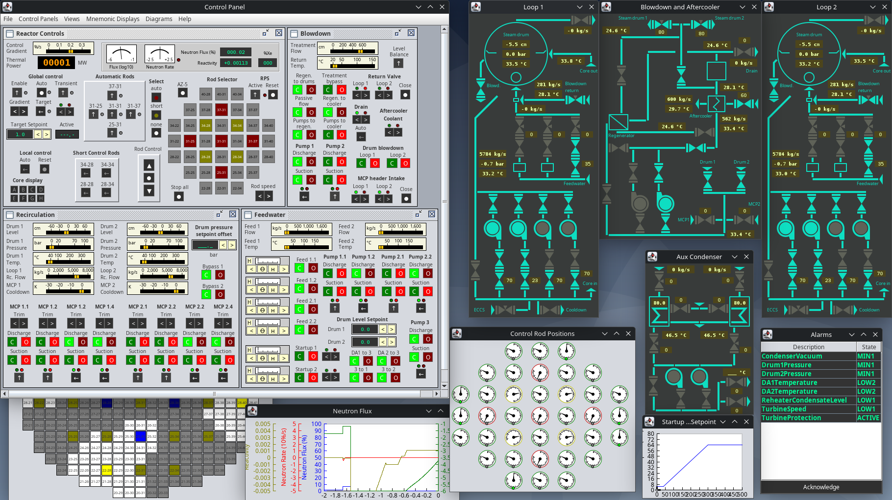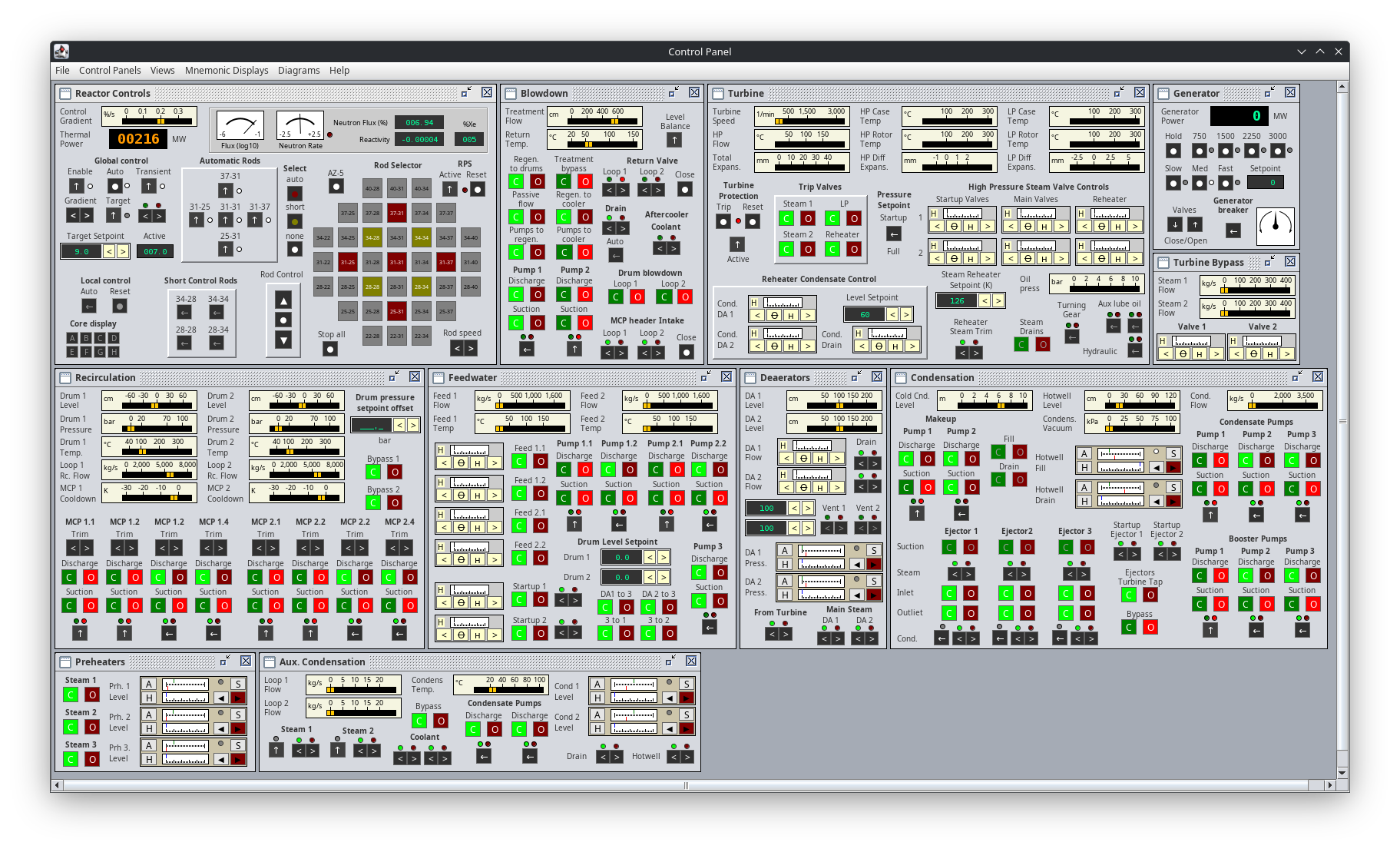 The simulator starts with the main control panel, this control panel contains individual control panel widgets for each system of the plant.