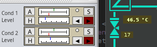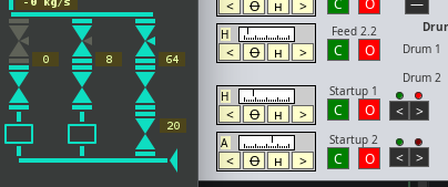 Other valves might be controlled by a control loop output (level control), there is a widget with four buttons for such valves. The indicator scale shows the current valve position. The two middle buttons switch between manual and auto mode, the outer buttons directly control the valves position. Active control loops are indicated with a lit up triangle on the mnemonic display. The valve control widget shows “H” on manual and “A” on auto mode.