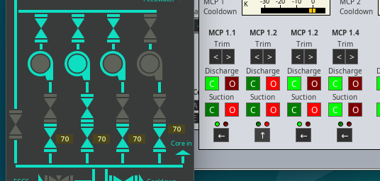 Centrifugal pumps have a valve on each side (suction and discharge). To turn on a pump, the discharge valve has to be closed. This ensures no reverse flow could ever turn the pump when switching the motor on. This is enforced in the simulator. Each pump on the control panel can be found on a mnemonic display showing the current pump state. The suction valve usually remains open and has to be opened before turning on the pump.