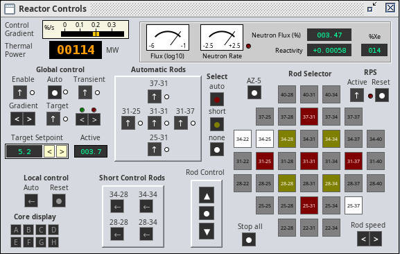 There are a total of 28 manual control rods, 5 automatic control rods and 4 short rods from below. Rods can be selected with the rod selector and moved using the rod control buttons. Note that the short control rods (yellow) have their direction reversed. Manual (gray) and automatic (red) control rods are inserted from the top so the reactivity increases with them going up out of the core. The yellow rods need to be moved downwards to increase reactivity.